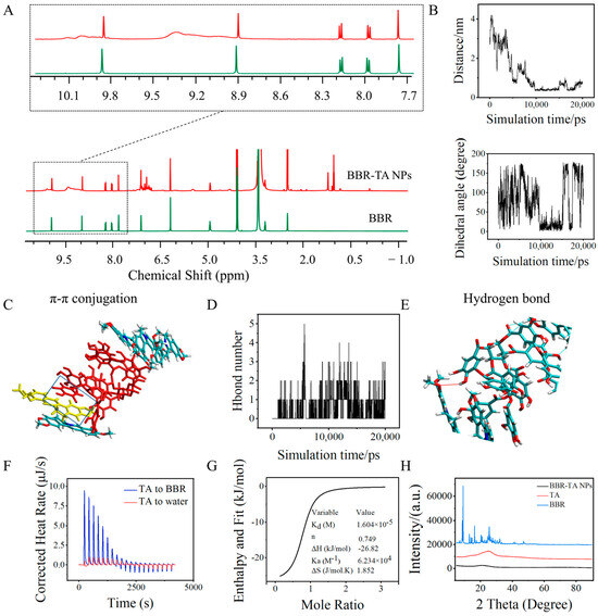 Co-assembly mechanism of BBR-TA NPs. (A) 1H NMR spectrum of BBR and BBR-TA NPs. (B–E) MD simulation of the interaction of BBR and TA. (F,G) ITC thermodynamic parameters of the titration of BBR-TA NPs by the BBR solution titrated with the TA solution (4 mM TA titration to 0.4 mM BBR; 4 mM TA titration to water). (H) X-ray diffractogram of BBR, TA, and BBR-TA NPs.