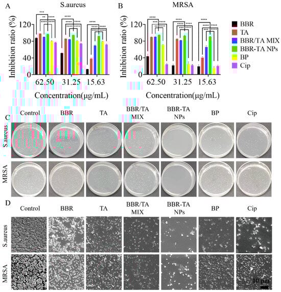 Antibacterial effect of BBR-TA NPs. (A) Inhibition ratio of S. aureus treated with different concentrations of BBR, TA, BBR/TA MIX, BBR-TA NPs, BP, and Cip. (B) The inhibition ratio of MRSA was treated with different concentrations of BBR, TA, BBR/TA MIX, BBR-TA NPs, BP, and Cip. (C) The survival numbers of S. aureus and MRSA were treated with blank media (control), BBR, TA, BBR/TA MIX, BBR-TA NPs, BP, and Cip. (D) SEM images of biofilm incubated with the blank media (control), BBR, TA, BBR/TA MIX, BBR-TA NPs, BP, and Cip against S. aureus and MRSA (scale bar = 10 μm). ** p < 0.01; *** p < 0.001; **** p < 0.0001.