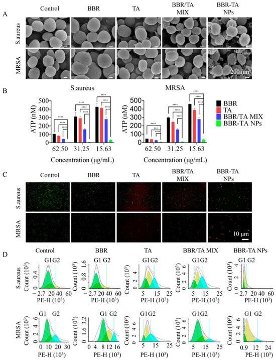 Antibacterial mechanism of BBR-TA NPs. (A) Interaction of BBR, TA, BBR/TA MIX, and BBR-TA NPs with S. aureus and MRSA via SEM (scale bar = 200 nm). (B) The effect of BBR, TA, BBR/TA MIX, and BBR-TA NPs on the concentration of ATP in S. aureus cells and MRSA cells. (C) The effect of BBR, TA, BBR/TA MIX, and BBR-TA NPs on the membrane integrity of S. aureus and MRSA cells via LIVE /DEAD fixable dead cell stain assay (scale bar = 10 μm). (D) The effect of BBR, TA, BBR/TA MIX, and BBR-TA NPs on the cell cycle distribution of S. aureus and MRSA. *** p < 0.001; **** p < 0.0001.