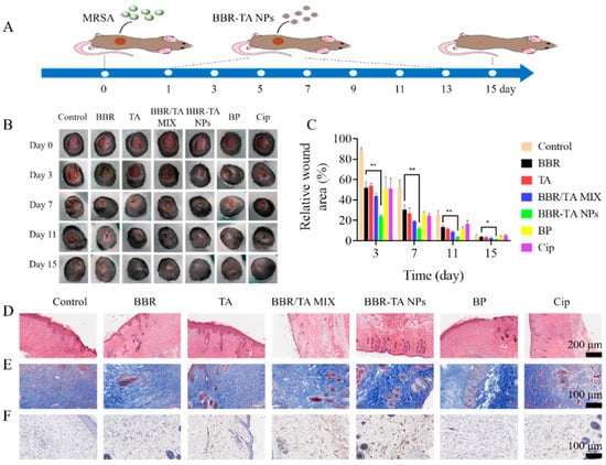 The anti-infection and wound-healing effects of BBR, TA, BBR/TA MIX, BBR-TA NPs, BP, and Cip were evaluated using a mouse infection model. Male C57/6J mice (weight: 22–24 g) were purchased from Beijing Huafukang Biology Science and Technology Co., Ltd. (Beijing China). The mice were injected intraperitoneally with 4% chloral hydrate at a dose of 10 mg/kg. The hair on the back skin of the mice was shaved. The mice were sterilized with 0.5% iodophor, and an aseptic operation was performed. To establish an infectious wound model in mice, a full-thickness skin wound of 8 mm diameter was made by cutting the dorsal skin of mice with a sterile circular skin puncture device [40,41]. MRSA suspension was dropped directly onto the wound. The mice were randomly divided into control, BBR, TA, BBR/TA MIX, BBR-TA NPs, BP, and Cip groups. The concentration in each group was 15.63 μg/mL. Then, 20 μL of the drug was smeared on the wound surface of the mice, and the wound was bandaged with an aseptic gauze (administration occurred once every other day). Images of the wound healing process were taken by using a digital camera at different time points (Day 0, 3, 7, 11, and 15), and the wound area was quantified using image analysis software (ImageJ, National Institutes of Health, Bethesda, MA, USA). The wound healing rate was calculated using the following formula: