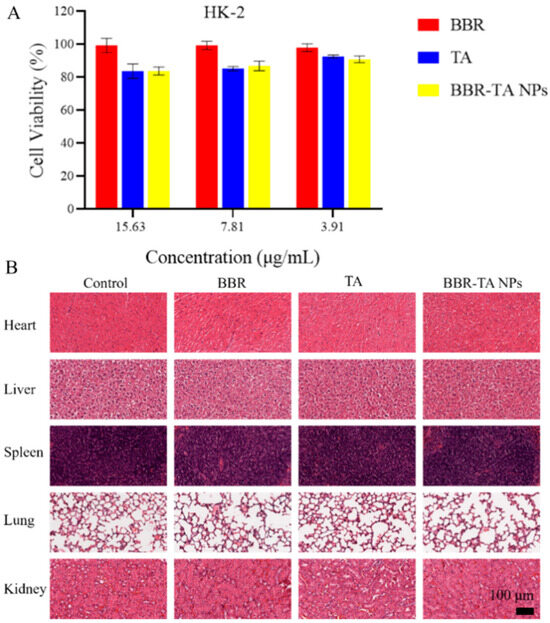 Biosafety evaluation of BBR-TA NPs. (A) Cell viability after incubation with BBR, TA, and BBR-TA NPs for treatment of 24 h. (B) Representative H&E staining photomicrographs of the major organs of the mice including the heart, liver, spleen, lung, and kidney at day 15 after surgery (scale bar = 100 μm).
