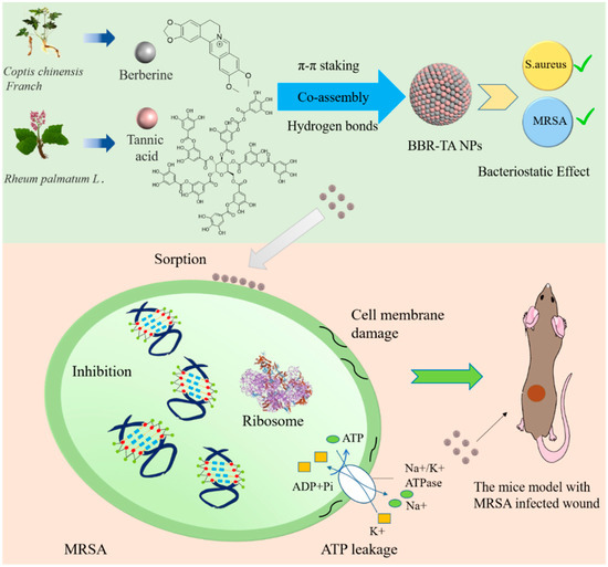 Based on this hypothesis, we determined whether the two natural products can co-assemble to form an ordered nanostructure and exert a better antibacterial effect. The preparation of berberine–tannic acid nanoparticles (BBR-TA NPs) was carried out by the solvent evaporation method. Although there are many methods for preparing nanoparticles, such as the spontaneous emulsion solvent diffusion method, salting-out emulsion diffusion method, nanoprecipitation method, etc., the solvent evaporation method is the simplest method, and nanoparticles with a small size and good dispersion are obtained. The results revealed that the nanostructures could be co-assembled at a 1:1 molar ratio. These nanostructures had the best antibacterial effect compared with other physical mixtures and crude compounds used against Gram-positive bacteria (e.g., Staphylococcus aureus-S. aureus and Multidrug resistant Staphylococcus aureus-MRSA). In addition to the synergistic effect exerted by the two compounds, the antibacterial action mechanism of the nanostructures was that they more easily adhered to the surface of the bacterial cell wall. Furthermore, the in vivo bacteria-infected wound healing effect of BBR-TA NPs was verified using an MRSA-infected mouse model, and they displayed better efficacy than BBR, TA, and first-line antibiotics (benzylpenicillin potassium-BP and ciprofloxacin-Cip). BBR-TA NPs thus benefited from the superiority of nanomedicine and combination therapy. This design acts as a feasible reference for developing non-antibiotic drugs based on natural products to combat antibiotic-resistant bacterial infections. The schematic illustration of the co-assembly and the antibacterial mechanism of the BBR-TA NPs is presented in Scheme 1.