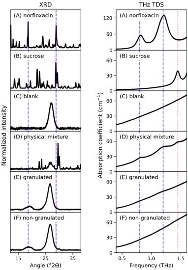 Normalized X-ray powder diffractogram (left panel) and THz absorption spectra (right panel) of (A) crystalline norfloxacin, (B) crystalline sucrose, (C) blank smartFilm tablet, (D) physical mixture tablet containing 20 w/w% sucrose and 10 w/w% norfloxacin, (E) granulated norfloxacin-loaded smartFilm tablet and (F) non-granulated norfloxacin-loaded smartFilm tablet. The horizontal lines mark the most prominent diffraction peaks (panels on the left, XRD) or the characteristic absorption features (panels on the right, THz TDS) of crystalline norfloxacin (dashed blue lines) and sucrose (dotted red line). For clarity, only one diffractogram/spectrum is shown per sample type.