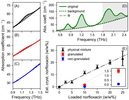 Then, the extracted peak parameters were kept as fixed properties and used to extract the amount of crystalline norfloxacin in the smartFilm tablets. For that, physical mixtures containing a known amount of crystalline norfloxacin (2.5, 5, 10, 15, 20 and 25 w/w%) were investigated with THz TDS to determine a scaling factor. The absorption coefficient was calculated analogously to the previous samples. In general, the usable spectral bandwidth is limited by the frequency-dependent dynamic range and signal-to-noise ratio of the THz signal [49,50]. All physical mixtures and smartFilm tablets had a larger thickness than the pure norfloxacin sample, leading to a greater absorbance and therefore limiting the frequency range, for which the absorption coefficient could be extracted. In order to ensure a consistent analysis of all samples, only the spectral range between 0.4 and 1.8 THz was analyzed. The frequency region that was not considered for the analysis of the physical mixtures and smartFilm tablets is marked as the grey shaded box in Figure 2D. Furthermore, only the first three absorption peaks of norfloxacin (Table 1) were considered in the analysis. Hence, the following fit function was applied to the absorption spectra: