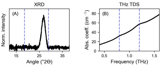 For the THz TDS measurements, a fiber-coupled system was used in transmission mode. To minimize the absorption of THz radiation due to the ambient air humidity, all measurements were performed under a nitrogen atmosphere. Details about the THz TDS system and the technique can be found in references [39,40]. The THz beam path was formed by using four off-axis-parabolic mirrors and the samples were placed in the focal plane between the second and the third mirror. The time-resolved waveform of a THz electromagnetic transient passing through a sample was recorded. Reference measurements were taken by moving the samples out of the THz beam. In total, five measurements each with 100 averages per sample were recorded. To calculate the absorption coefficient spectra, the THz waveforms were analyzed using the TeraLyzer software [41]. The software is based on algorithms presented in references [42,43] and enables the evaluation of the refractive index, absorption coefficient, and sample thickness simultaneously. The resulting spectral resolution was 0.01 THz.