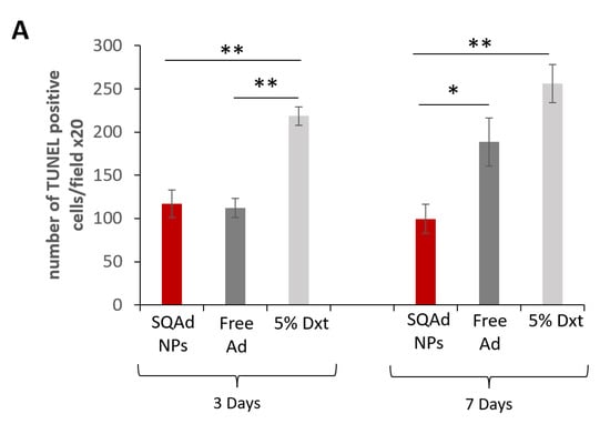 Immunofluorescence evaluation of cell apoptosis on heart sections. (A) Graphical comparison of the number of TUNEL-positive nuclei between the different treatment groups. Results are expressed as means ± S.E.M of 5–7 animals per condition. * p < 0.05, and ** p < 0.01. Significance is evaluated using GraphPad Prism 7.0 Software and Excel Software Statistics (Microsoft Office 365), a Student t test analysis was performed between groups. (B) Representative images were obtained on heart sections after TUNEL staining, at two different time points (3 and 7 days) and on three groups (SQAd NPs, Free Ad and 5% Dxt). Scale bar 100 µm.