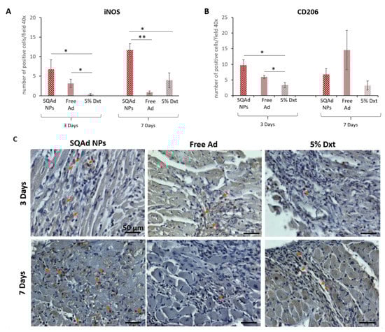 Our results showed more iNOS positive cells (Figure 8A,C) in the SQAd NPs group than in the Dxt 5% group (p < 0.05), but there was no significant difference between SQAd NPs and free Ad groups at day 3 post treatment. Interestingly, at day 7 post-treatment, the number of iNOS positive cells was significantly higher in the SQAd NPs group, as compared to group treated with free adenosine (p < 0.005) or Dxt 5% control solution (p < 0.05).