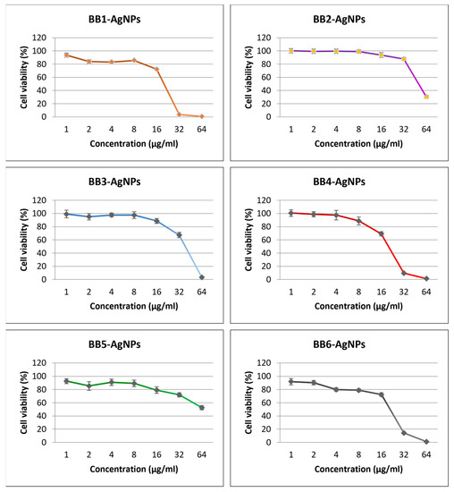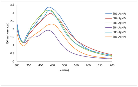 | BB1-AgNPs | BB2-AgNPs | BB3-AgNPs | BB4-AgNPs | BB5-AgNPs | BB6-AgNPs | |