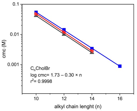 In the pre- and postmicellization zones, the specific conductivity values conform to two straight lines with different slopes. Due to the lower mobility of the micelle compared to the monomers and the binding of some counterions to it, the slope changes abruptly [6]. The cmc value was determined from the location of the breakpoint. The degree of ionization, α, is determined by the ratio of the slopes of the linear regions above and below the cmc. The degree of binding of the counterion to the micelle, β, is 1-α. The β binding degree estimates the counterions contained in the Stern layer to counteract the electrostatic force opposing self-assembly. The cmc values of cholinium-based ionic liquid progressively decrease with the increase in the alkyl chain length (Table 2), as occurs for amphiphilic imidazolium and pyridinium-based ionic liquids [4,35,36]. The cmc values for cholinium-based ILs were slightly higher than those reported for imidazolium (1-alkyl-3-methylimidazolium bromides, CnMeImBr) and pyridinium (1-alkylpyrinidinium bromides, CnPyrBr) ionic liquids [4]. This means that the more polar cholinium head group makes micelle formation slightly less energetically favorable. According to the empirical Stauff–Klevens Equation (1) [37], there is a linear relationship between log cmc and alkyl chain length (Figure 2).
