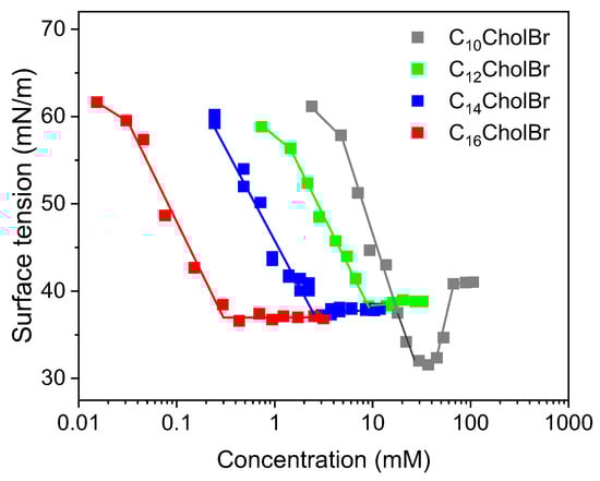 Surface tension measurements were used to study the surface activity of CnCholBr. Figure 3 displays the plots of surface tension (γ) vs. the logarithm of concentration for the cholinium-based ILs in aqueous solution at 25 °C.