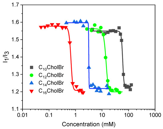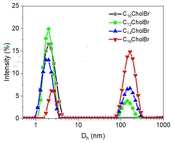 For the C10CholBr homolog, a size distribution with a hydrodynamic diameter, Dh, was observed with a maximum scattering intensity at 2.0 nm (Figure 5). For the rest of the CnCholBr homologs (C12 to C16), the intensity distribution profiles (Figure 5) display two size distributions, one with a hydrodynamic diameter, Dh, with a maximum scattering intensity in the range of 2.0–2.5 nm and the other with Dh in the range of 145–170 nm. Lower Dh values have been attributed to micelle diameter, whereas larger Dh values could be attributed to micellar agglomerates [42]. The number-weighted size distributions (Figure S5, Supplementary Materials) indicate that the number of small micelles prevails over that of micellar agglomerates. The results suggest the spontaneous formation of small micelle-like aggregates during the self-assembly of cholinium-based ionic liquids.