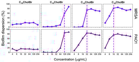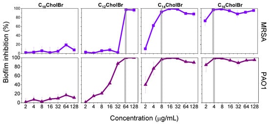 The results of the biofilm elimination assays showed that CnCholBr compounds behaved similarly against MRSA and PAO1 biofilms and that their biofilm eradication ability was essentially dependent on their alkyl chain length (Figure 7). C10CholBr showed no biofilm eradication activity, whereas the C12–C16 homologs were able to efficiently disperse preformed biofilms (75–90%) in a dose-dependent manner. The longer homologs, C14CholBr and C16CholBr, showed a high antibiofilm effect at low concentrations (Figure 7). Thus, C14CholBr and C16CholBr are able to remove >80% of the adhered biomass at concentrations as low as 32 and 16 µg/mL, respectively. The concentration of ionic liquid required to eradicate preformed biofilms (Figure 7) is about four times higher than that required to inhibit biofilm formation (Figure 6), which corroborates the greater difficulty of treating bacterial biofilms with respect to planktonic bacteria [47,48].