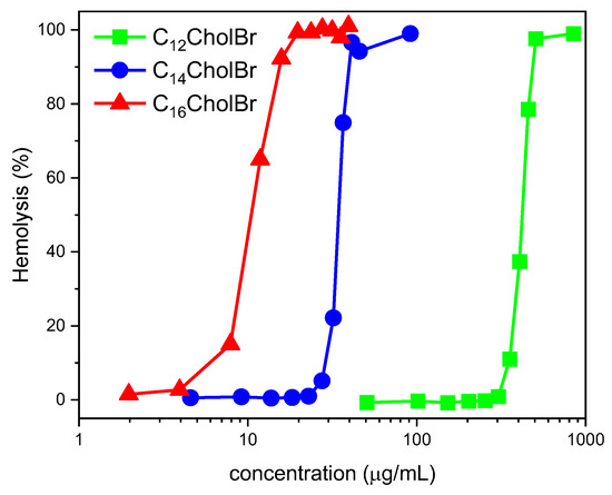When the MIC values of the cholinium-based ILs (Table 3) are compared to their cmc values (16,757, 4737, 1246, and 351 expressed as µg/mL for the C10, C12, C14, and C16 homologs, respectively), it is clear that self-aggregation processes occur at concentrations that are higher than those required for antimicrobial activity. This indicates that the toxicity of cationic amphiphiles against bacteria is mainly exerted by monomeric species.