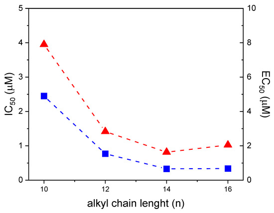 When plotting the toxicity values against the alkyl chain length of the ionic liquid, toxicity increases (lower IC50 and EC50 values) with increasing alkyl chain length from 10 to 14 carbon atoms, while toxicity is maintained or slightly decreased for the C16CholBr (Figure 10).