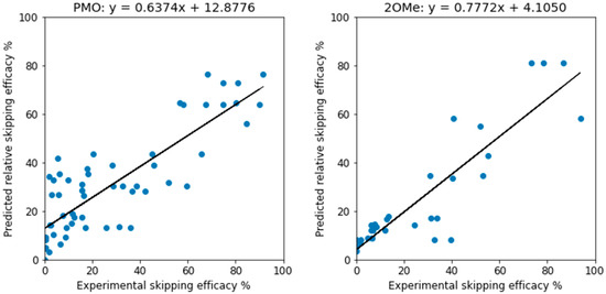 When the three-way-voting models, trained on the training data with all features, were applied to the test data, the predictions were similarly assessed. For PMO, we have R2 = 0.706 and MAE = 12.250 and for 2OMe, R2 = 0.795 and MAE = 9.237. The R2 values are higher than those reported [37], which were 0.6 and 0.7, respectively. The true efficacy and predicted one have a good linear correlation, as depicted in Figure 1. It shall be noted that unlike the support vector regressor, which can generate unrealistic, negative efficacy values, the three-way voting approach will not possibly predict a negative efficacy as long as the input data has no negative efficacy.