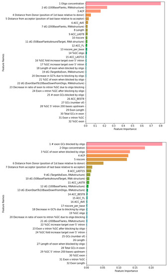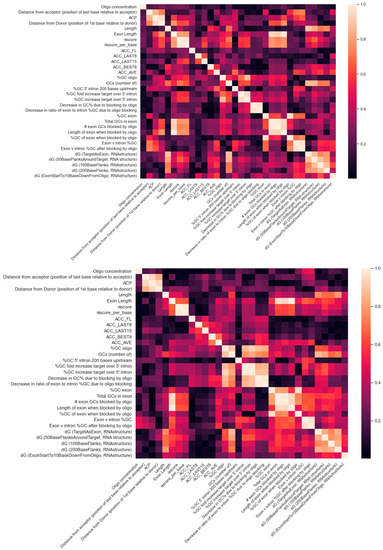 The feature importance ranking using the training data as reported by the three-way voting is shown in Figure 2. The rankings using the test data are similar on top-ranked features, suggesting that overfitting is not a concern. Among the top five and ten features using training or test dataset, three (ACP, oligo concentration, dG (100BaseFlanks, RNAstructure)) and eight (ACC_AVE, ACC_LAST8, ACP, distance from acceptor (position of last base relative to acceptor), length, oligo concentration, dG (100BaseFlanks, RNAstructure), dG (200BaseFlanks, RNAstructure)) are common for PMO, and four (# exon GCs blocked by oligo, %GC of exon when blocked by oligo, ACP, Oligo concentration) and nine (# exon GCs blocked by oligo, %GC of exon when blocked by oligo, ACC_LAST15, ACP, distance from donor (position of first base relative to donor), oligo concentration, dG (50BaseFlanksAroundTarget, RNA structure), dG (TargetAsExon, RNAstructure), niscore) are common for 2OMe. The four PMO features (oligo concentration, exon v intron %GC after blocking by oligo, dG (50BaseFlanksAroundTarget), ACC LAST15) used in Chiba et al. here were ranked at 1, 24, 11, and 15. The 6 2OMe features (oligo concentration, GCs (number of), ACP, %GC of exon when blocked by oligo, niscore per base, ACC LAST8) used in Chiba et al. here were ranked at 2, 25, 4, 3, 17, and 11. In both cases, some correlation can be observed. We also noted that some features were strongly correlated, as shown in Figure 3. As an example, niscore and niscore_per_base are strongly correlated. Niscore_per_base was ranked seventeenth, but niscore was ranked fifth in our 2OMe model. Therefore, at least some discrepancies can be attributed to the feature correlations. Due to the randomness in the algorithms, the rank order can be slightly different in each run. We also did not filter out strongly correlated features as the cut-off threshold for correlation coefficient is to some extent arbitrary.