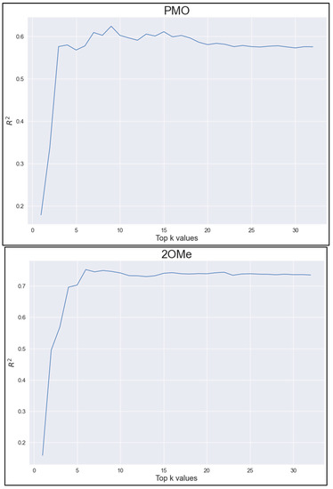 Top k features. R2 as a function of top k features when top k features were used for 10-fold cross validation on the training dataset (top for PMO and bottom for 2OMe).