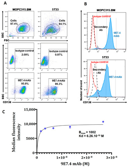 The specificity of mAb 9E7.4 for murine CD138 has been confirmed previously in the 5T33 cell line [13]. Here, we evaluated, by flow cytometry, the expression of CD138 in MOPC315.BM compared with the 5T33 cell line (Figure 1). The results show strong CD138 expression in both MM cell lines, with good specificity confirmed by the absence of non-specific binding of the control isotype (Figure 1A). However, CD138 expression appears slightly higher and more homogeneous (Figure 1B) in MOPC315.BM cells (95.9% versus 86.3% in 5T33 cells). Based on these results, MOPC315.BM cells were selected for the next steps of this work. Furthermore, the MOPC315.BM line is implantable in immunocompetent mice with the occurrence of paraplegia (sign of spinal cord compression) in all mice within 3–4 weeks [18] and has tropism for the bone marrow, inducing osteolytic lesions that mimic human disease. Thereafter, the affinity of the 9E7.4 antibody for the CD138 target on the MOPC315.BM cell line was determined by flow cytometry with increasing concentrations of the antibody (Figure 1C). Results demonstrate a dissociation constant (Kd) value of 0.626 nM.