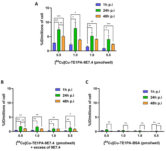 In vitro cellular binding assays. Cellular binding of (A) [64Cu]Cu-TE1PA-9E7.4, (B) [64Cu]Cu-TE1PA-9E7.4 with an excess of 9E7.4, (C) [64Cu]Cu-TE1PA-BSA, to MOPC315.BM cells using 4 concentrations of radiotracers at 3 different time post-incubation. Results are expressed as % activity injected per million cells (n = 3; multiple t-test, (*) p < 0.02, (**) p < 0.009, (***) p < 0.0007).