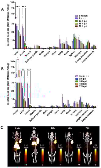 Mice were imaged at 5 min, 24 h, 48 h and 72 h p.i. A group of mice imaged at 72 h p.i. was used for the 72 h p.i. time of biodistributions. Mice were maintained under general anaesthesia with a mixture of 2% isoflurane and 5% air for the duration of the acquisition. Image acquisition was performed with the IRIS PET-CT imager (Iris, Inviscan, Strasbourg France) using a 10-min static whole-body acquisition mode combined with a 20-s CT acquisition (energy window of 250-750 keV and FOV size of 90 mm). The CT acquisition parameters were 80 kV, 0.9 mA, 576 projections and 160 µm voxel size. Filtered back-projection algorithm with beam hardening and ring artefact correction was used. PET images were reconstructed with the 3D Ordered Subsets Expectation Maximization (3D-OSEM-MC,) algorithm, 8 subsets, 8 iterations with correction of decay, random and dead-time. PET and CT were converted into DICOM format and processed with OsiriX Medical Imaging software (version 11.0.1, Pixmeo, Bernex, Switzerland).