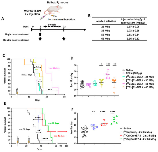 Activity-escalation study and repeated dose regimen. (A) Treatment schedule for single or repeated dose treatment after intravenous tumour cells injection (2 × 105 cells). (B) Total activity injected per group expressed in MBq and MBq per gram of body weight (MBq/g). Kaplan–Meier survival curves of mice following single dose of treatment (C), and repeated doses of treatment (E) (n = 5–15; (*) p < 0.01, (**) p < 0.03, (***) p < 0.0002, (****) p < 0.0001; Log-rank (Mantel–Cox) test). Total duration of the study was 100 days. (D,F) Day of sacrifice of each mouse, bar represents the median survival, (1) surviving mice were excluded. ms: median survival. Created with Biorender.com.