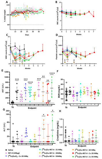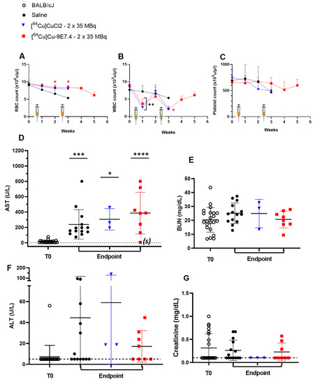 Biochemical analysis of liver toxicity showed a significant increase in mean AST levels in each of the three cohorts compared with the baseline levels observed at time T0 (Figure 7D), with a greater increase in values for the [64Cu]Cu-TE1PA-9E7.4-treated group (from 14.3 ± 12.7 U/L at T0 till 386.2 ± 196.2 U/L, p < 0.0001). Again, for the mouse that survived to the end of the study, the AST level assayed at sacrifice was equivalent to the baseline at T0 (see (s) on the graph). For ALT assays in each cohort at sacrifice, the values obtained were not significantly different than those of mice in the T0 reference group (Figure 7F). As in the orthotopic model, no significant differences were observed in creatinine (Figure 7G) or BUN levels (Figure 7E), which are markers of potential renal toxicity.