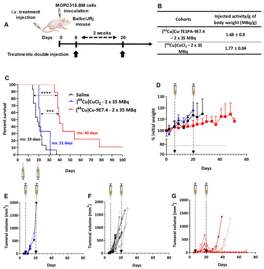 Therapy experiment with repeated dose of treatments and saline in BALB/cJRj mice bearing s.c MOPC315.BM tumours. (A) Treatment schedule for repeated dose treatment after s.c tumour cells injection (2 × 105 cells). (B) Total activity injected per group expressed in MBq and MBq per gram of body weight (MBq/g). (C) Kaplan–Meier survival curves. Total duration of the study was 100 days. (n = 3–15; (***) p < 0.0002, (****) p < 0.0001, Log-rank (Mantel–Cox) test). (D) Mean body weight variation for each group expressed as a % of initial body weight. Tumour growth curves for mice receiving (E) [64Cu]CuCl2 (n = 3), (F) saline (n = 10), or (G) [64Cu]Cu-TE1PA-9E7.4 (n = 10). Each curve represents a mouse. Tumour volume was measured twice per week until signs of tumour necrosis, paralysis or volume reached 2000 mm3. Created with Biorender.com.