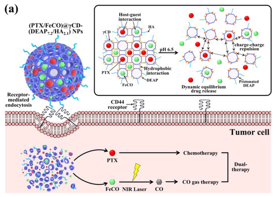 In the development of stimuli-sensitive drug delivery systems, designing site-specific drug carriers by engineering functional biopolymers has often resulted in increasing the local drug dose or maximizing the drug efficacy at specific locations, thus reducing side effects [1,2,3,4]. In particular, the various functionalities of biopolymers or bioactive materials endow drug carriers with attractive physicochemical reactivity and benefit drug carrier reactions with genetic materials, proteins, and biosignals [2,5,6,7]. Cyclodextrin (CD), a cyclic oligosaccharide, is a known host molecule with a central cavity that allows the inclusion of a guest drug molecule [8,9,10,11]. Remarkably, chemically incorporating functional molecules into CDs is an interesting strategy that strengthens the site-specific bioreaction of CDs, which has often been used to improve drug therapeutic efficacy [10,11,12,13]. Recently, multifunctional CD-based nanoparticles (NPs) have been widely reported for the efficient transportation of antitumor drugs to tumors in response to specific stimuli such as temperature, light, redox, and pH [14,15,16,17,18]. However, such drug carriers have not always shown excellent antitumor effects because they may not overcome the complexities of the cells during the treatment process [16,19,20,21]. Importantly, it has often been reported that when functional drug carriers transport two or more drugs and respond to multiple stimuli, their multifaceted antitumor effect can sometimes enhance therapeutic outcomes more effectively than a single-drug administration system [16,19,20,21,22].