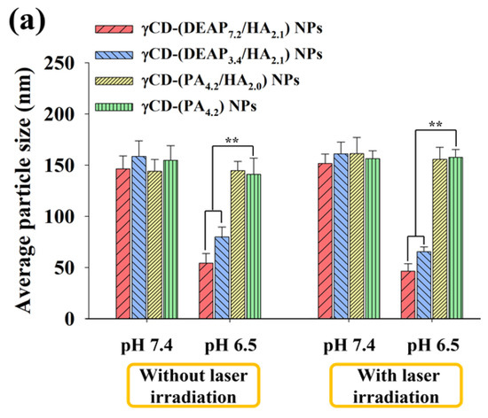 Figure 2a shows that the particle size of γCD-(DEAP7.2/HA2.1) NPs decreased from 146 nm at pH 7.4 to 54 nm at pH 6.5, probably owing to DEAP protonation at pH 6.5 [17,27,30,31]. In γCD-(DEAP7.2/HA2.1) NPs, the particle size reduction at pH 6.5 was much greater than that of γCD-(DEAP3.4/HA2.1) NPs, revealing the effect of a high DEAP conjugation ratio. In addition, under 1 W/cm2 laser irradiation for 10 min, the changes in the particle size of all the NPs were not significant.