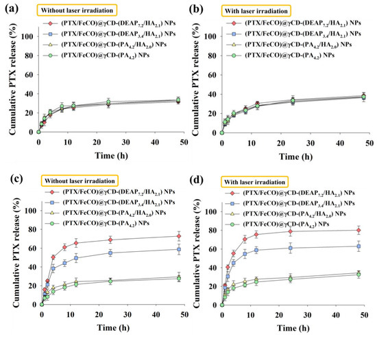 Cumulative PTX release profiles from each type of γCD NP (a) without or (b) with NIR laser irradiation at pH 7.4. Cumulative PTX release profiles from each type of γCD NP (c) without or (d) with NIR laser irradiation at pH 6.5 (808 nm, 1 W/cm2, 10 min, n = 3, as multiple experiments).
