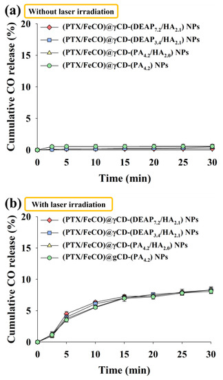 Cumulative CO release profiles from each type of γCD NP for 30 min at light intensities of (a) 0 W/cm2 and (b) 1 W/cm2 using an NIR laser (n = 3, as multiple experiments). The cumulative release of CO (%) was calculated by determining the ratio between the CO values released from NPs and the CO values that would theoretically be released from FeCO.