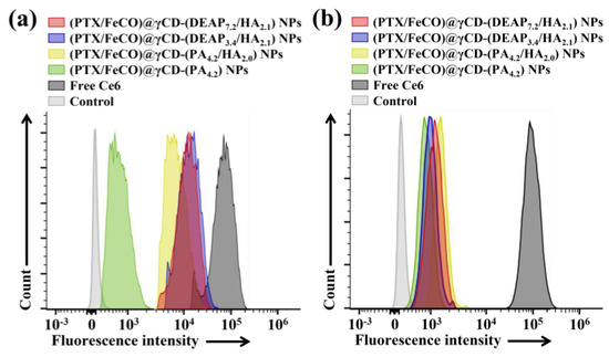 Flow cytometry analysis of (a) MCF-7 cells and (b) BT-474 cells treated with each type of NP (equivalent to 10 μg/mL Ce6) or free Ce6 (10 μg/mL) for 4 h at 37 °C.