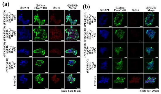 Confocal images of (a) MCF-7 cells and (b) BT-474 cells treated with each type of NP (equivalent to 10 μg/mL Ce6) or free Ce6 (10 μg/mL) for 4 h at 37 °C. The treated cells were stained with ① DAPI and ② WGA-Alexa Fluor® 488. In addition, ③ florescent Ce6 was located in NPs.