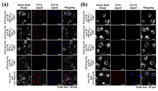 The cellular uptake of γCD-based NPs by MCF-7 (CD44 receptor-positive) [37,38] and BT-474 (CD44 receptor-negative) [29] tumor cells was evaluated using flow cytometry and confocal laser scanning microscopy. Before testing, each γCD-based NP was labeled with the fluorescent dye Ce6; Ce6 was bound at an average molar ratio of 1.1 molecules per γCD unit [17,18]. Figure 5a shows that the γCD-based NPs with HA exhibited higher fluorescence intensity in MCF-7 cells than the γCD-based NPs without HA, revealing the HA ligand in the γCD-based NPs mediated extensive CD44 receptor interactions. However, all NPs showed relatively decreased cellular uptake by BT-474 cells that did not express the CD44 receptor (Figure 5b). In addition, free Ce6, which had no cell-specific interaction abilities, interacted well with both MCF-7 and BT-474 cells. It is known that free Ce6 is well absorbed even by normal cells. Moreover, the confocal microscopy images supported that the γCD-based NPs with HA had higher cellular uptake (i.e., a higher Ce6 signal) in MCF-7 cells than in BT-474 cells, suggesting that γCD-based NPs with HA could effectively target tumor cells with specific CD44 receptors (Figure 6) [29,37,38]. We also evaluated the cellular uptake of PTX and FeCO delivered by γCD-based NPs using a hyperspectral camera [17,18]. The resulting images demonstrated that the γCD-based NPs with HA enabled higher cellular uptake of PTX and FeCO in MCF-7 cells than in BT-474 cells (Figure 7a,b), indicating that the NPs successfully delivered PTX and FeCO into MCF-7 cells.