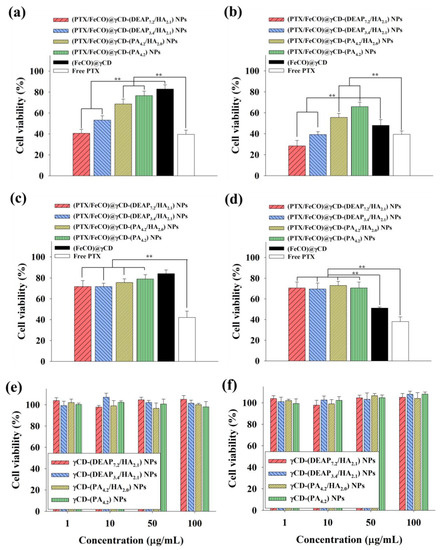 Next, we encapsulated PTX and FeCO (as antitumor model drugs) into γCD-(DEAP/HA) NPs via a dialysis method [17,18]. Here γCD with unprotonated DEAP (pKb ~ 6.8) self-assembled at pH 7.4 to form a porous γCD core, probably owing to hydrophobic interactions between unprotonated DEAP moieties, while HA segments self-assembled into a hydrophilic shell. Importantly, PTX and FeCO were embedded in γCD-(DEAP/HA) NPs, probably owing to hydrophobic interactions between PTX and FeCO with unprotonated DEAP moieties and possible host–guest interactions in the γCD rings (Figure 1a). As a result, the loading efficiencies of PTX (%) in γCD-(DEAP7.2/HA2.1) NPs, γCD-(DEAP3.4/HA2.1) NPs, γCD-(PA4.2/HA2.0) NPs, and γCD-(PA4.2) NPs were found to be 51.5 ± 2.3, 49.5 ± 2.7, 50.5 ± 3.2, and 52.0 ± 1.4%, respectively. The loading contents of PTX in γCD-(DEAP7.2/HA2.1) NPs, γCD-(DEAP3.4/HA2.1) NPs, γCD-(PA4.2/HA2.0) NPs, and γCD-(PA4.2) NPs were 27.6 ± 2.4, 26.8 ± 1.6, 27.5 ± 3.1, and 27.7 ± 2.9%, respectively. Furthermore, the loading efficiencies of FeCO (%) in γCD-(DEAP7.2/HA2.1) NPs, γCD-(DEAP3.4/HA2.1) NPs, γCD-(PA4.2/HA2.0) NPs, and γCD-(PA4.2) NPs were 43.1 ± 3.7, 42.5 ± 2.5, 40.0 ± 3.3, and 43.1 ± 2.7%, respectively. Similarly, the loading contents of FeCO in γCD-(DEAP7.2/HA2.1) NPs, γCD-(DEAP3.4/HA2.1) NPs, γCD-(PA4.2/HA2.0) NPs, and γCD-(PA4.2) NPs were 18.5 ± 2.6, 18.4 ± 2.0, 17.4 ± 1.9, and 18.4 ± 2.2%, respectively. However, when the pH of the environment becomes slightly acidic (i.e., endosomal pH), DEAP protonation destabilizes the NPs, weakening the host–guest equilibrium in γCD and thereby accelerating the release of PTX and FeCO [9,10,27,32,33]. In addition, under NIR irradiation, FeCO can be converted into CO gas that attacks the mitochondria of tumor cells (Figure 1a). Based on this hypothesis, we focused on identifying the physicochemical properties of γCD-based NPs and their in vitro antitumor efficacy.
