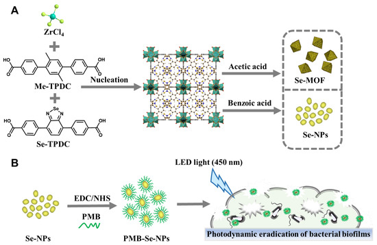 Recently, we described a facile approach for synthesizing photosensitive MOFs with mixed ligands for the photodynamic inactivation of bacteria [45]. To confer photodynamic properties upon MOFs, a benzoselendiazole-containing ligand (Se-TPDC) was incorporated into MOF skeletons, forming benzoselendiazole-doped MOFs (Se-MOFs). Although Se-MOFs have been demonstrated to effectively inhibit the formation of bacterial biofilms, their size precludes their passage through the intricate mesh of biofilm matrices and the narrow diffusion channels between bacterial clusters, thereby restricting their ability to penetrate and diffuse within a biofilm. Additionally, the poor diffusion and limited penetration of Se-MOFs within biofilms result in therapeutic failure. Thus, the development of nanoscale MOFs might be an effective way to enhance their biofilm permeability. In this study, we used benzoic acid as a regulator to control the growth of MOFs and obtained photosensitive MOF-based nanoparticles (Se-NPs), as shown in Figure 1A. The 1O2 generation efficiency of the Se-NPs was compared with that of the Se-MOFs under visible-light irradiation. To further improve the efficiency of the biofilm eradication, an antibiotic drug, polymyxin B (PMB), was coupled onto the surface of the Se-NPs via amidation to yield PMB-modified Se-NPs (PMB-Se-NPs). The antibacterial mechanism of the PMB-Se-NPs was systematically studied using flow cytometry. Finally, the photodynamic efficiency of the PMB-Se-NPs in eradicating bacterial biofilms was assessed using a biofilm model of Pseudomonas aeruginosa bacteria (Figure 1B).