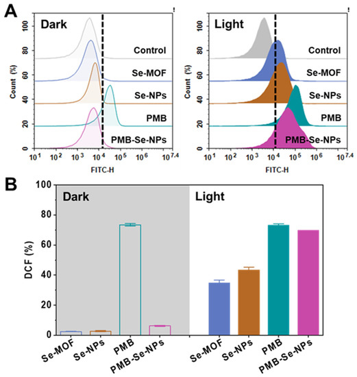 To evaluate the photodynamic efficacy of the PMB-Se-NPs, the 1O2 generation inside the bacteria was monitored using a DCFH-DA ROS Assay Kit. Non-fluorescent DCFA-DA could permeate live bacteria and be oxidized by 1O2 to produce dichlorofluorescein (DCF) compounds that would emit strong green fluorescence. The DCF fluorescence in the bacteria could be monitored using the FITC fluorescence channel of the flow cytometry. Without light irradiation, negligible fluorescence was detected from the bacteria treated with both the Se-MOF and the Se-NPs (Figure 4A). However, significant DCF fluorescence was detected inside the bacteria after treatment with two samples and light irradiation. Moreover, the Se-NPs had a higher level of 1O2 generation than the Se-MOF under light irradiation, which is in line with the ESR results (Figure 2F). In addition, the photodynamic activity of the PMB-Se-NPs was investigated and compared with the same concentrations of Se-NPs. The results showed that a much stronger fluorescence was found for the bacteria treated with the PMB-Se-NPs in contrast to those treated with the Se-NPs (Figure 4B). This outcome should have been because PMB can induce an increase in intramural ROSs in bacterial cells [47]. To investigate this issue, the 1O2 generation of PMB inside the bacteria was investigated. The bacteria incubated with the PMB-Se-NPs (32 µg mL−1, 1.0 mL) and the PMB (1.5 µg mL−1, 1.0 mL) were irradiated with a 450 nm LED lamp. Based on the percentage content of the PMB in the PMB-Se-NPs (4.7 wt%), the dosage of free PMB used for comparison was selected to be 1.0 mL of PBS that contained PMB (1.5 µg mL−1). The results showed that the PMB caused an increase in the ROS levels in the bacteria, which was unrelated to irradiation. Therefore, these results confirm that PMB-Se-NPs have synergistic antibacterial properties with photodynamic and antibiotic functions.