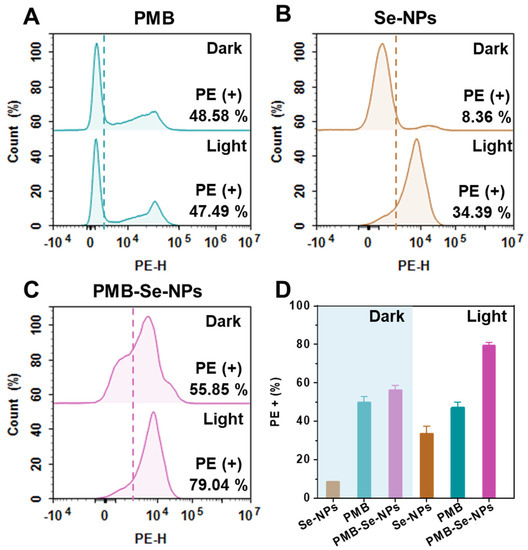 The synergistic antibacterial activity of the PMB-Se-NPs against P. aeruginosa was investigated with propidium iodide (PI) staining. PI is a red, fluorescent DNA-intercalating dye and can only penetrate damaged cell membranes. Bacteria with damaged cell membranes could bind with the PI and be monitored by the PE fluorescence channel of the flow cytometer. Both Se-NPs and PMB were used as control samples. The bacterial samples treated with the PMB showed that no significant difference in phototoxicity was observed with or without light exposure. This indicates that PMB is not photosensitive and the application of light does not significantly increase the percentage of bacterial death (Figure 5A). As shown in Figure 5B, no obvious cytotoxicity was observed for the Se-NPs in the dark. However, phototoxicity was observed clearly for the Se-NPs after light irradiation. This is attributed to the photodynamic activity of Se-NPs, which is activated under light conditions, leading to the generation of singlet oxygen that causes oxidative damage to the bacterial cell membrane. Compared with the Se-NPs, the PMB-Se-NPs exhibited higher phototoxicity against the bacteria (Figure 5C,D). The antibacterial activity of the PMB-Se-NPs was significantly enhanced, which could be explained due to the modification of the PMB on the surface of the Se-NPs. These results further confirm that the PMB-Se-NPs exhibited the synergistic therapeutic effects of antibiotic and photodynamic therapy.
