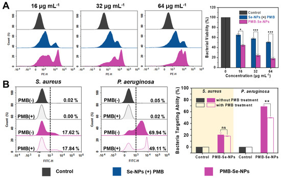 Synergistic antibacterial activity and mechanism analysis of PMB-Se-NPs. (A) Flow cytometry analysis of PI−stained bacteria treated with Se-NPs in combination with a PMB physical mixture or PMB-Se-NPs at concentrations of 16, 32, and 64 µg mL−1, following a 10 min light exposure incubation (450 nm, irradiance: 3 mW cm−2). (Results are presented as means ± S.D; n = 3. * p < 0.05 and *** p < 0.001). (B) Flow cytometric analysis was performed to evaluate the bacteria-targeting ability of PMB-Se-NPs toward S. aureus (Gram−positive) and P. aeruginosa (Gram−negative) strains, with and without PMB treatment. (Results are presented as means ± S.D, n = 3. ns = not significant; ** p < 0.01).
