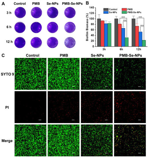Additionally, live/dead staining was used to evaluate the biofilm elimination ability of PMB-Se-NPs. After being incubated with different samples for 12 h, the biofilms were irradiated with light for 30 min and then co-stained with the SYTO 9 dye and propidium iodide (PI) to distinguish between live (green) and dead (red) bacteria cells. As shown in Figure 7C, a low level of red fluorescence was detected in the bacteria treated with PMB, indicating a low efficiency of PMB in eliminating biofilms. This outcome can be attributed to the poor penetration of PMB and the resistance to PMB of bacteria living in biofilm communities. In the Se-NP treatment group, the fraction of the green fluorescence signal representing live bacteria within the biofilm was significantly diminished. These results suggest that the photodynamic activity of Se-NPs can be activated under light conditions, leading to the generation of singlet oxygen capable of disrupting the biofilm and significantly loosening its structure. Notably, almost no live bacteria were found after treatment with PMB-Se-NPs. The above results are consistent with the CV staining assay. All these results demonstrated that PMB-Se-NPs exhibit synergistic antibiotic and photodynamic effects in eradicating bacteria biofilms.