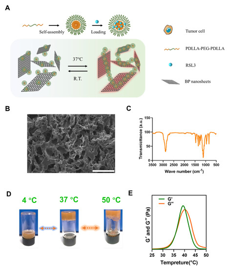 The RSL3/BP@PLEL hydrogel was successfully prepared as depicted in Figure 1A, and gelation was achieved by exploiting the thermosensitive property of PDLLA-polyethylene glycol (PEG)-PDLLA (PLEL) at physiologically relevant temperatures. First, a thermosensitive polymer (PLEL) was synthesized via stannous octoate catalyzed ring-opening polymerization. Its hydrogel formulation was then characterized using cryogenic scanning electron microscopy (cryo-SEM), Fourier-transform infrared spectroscopy (FT-IR), and rheometric analysis. As shown in Figure 1B and Figure S1, the PLEL hydrogel presented a classic 3D structure, enabling the further loading of anticancer drugs. The structure of PLEL contains a representative carbonyl group (~1600 cm−1), which was detected in its FT-IR spectrum (Figure 1C). The thermosensitive property of PLEL was also verified through rheometric analysis. As shown in Figure 1D, the gelation of PLEL at 37 °C was the most efficient, whereas at 4 °C or 50 °C, it was not very efficient. The rheometric analysis results (Figure 1E and Figure S2) further confirmed the above phenomenon was because of the lower critical solution temperature (LCST; 35 °C–40 °C) of both PLEL hydrogel and RSL3/BP@PLEL hydrogel. Therefore, the thermosensitive PLEL hydrogel is suitable for further drug loading and in vivo applications.