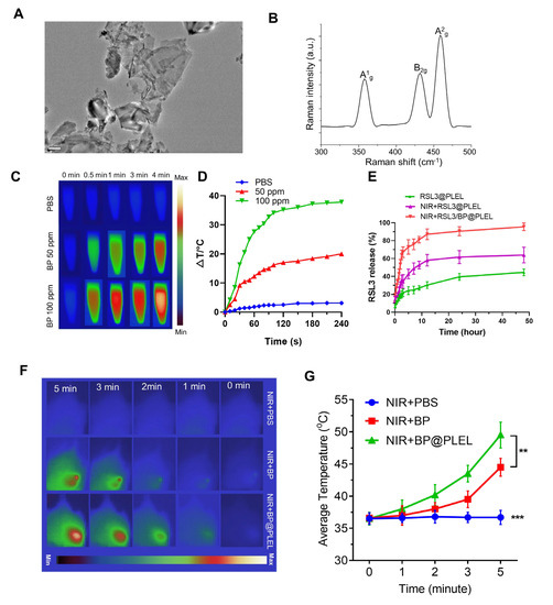 Photothermal properties of RSL3/BP@PLEL. (A) TEM images and (B) Raman spectra of BP nanosheets, scale bar = 200 nm. (C) In vitro photothermal images and (D) the corresponding temperature change in RSL3/BP@PLEL under NIR irradiation. (E) Photothermal responsive release kinetics of RSL3/BP@PLEL. (F) Photothermal images of mice bearing Hepa1-6cells after intratumoral injection of RSL3/BP@PLEL. (G) A plot of temperature change versus time in mice tumor. All data are shown as mean ± SD (n = 3), ** p < 0.01, and *** p < 0.001 vs. NIR + PBS group.