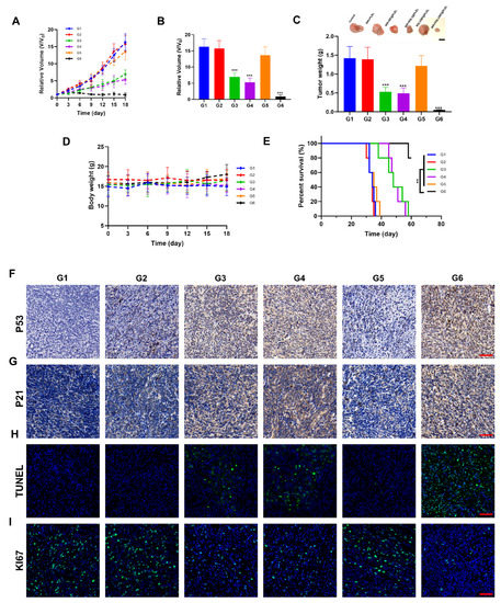 Anticancer efficacy of RSL3/BP@PLEL in mice bearing Hepa1-6 cells. A plot of (A) mice tumor growth, (B) mice tumor volume, and (C) mice tumor weight for each treatment group; inlet: representative photos of resected tumors collected from each treatment group, scale bar = 1 cm. (D) Body weight and (E) survival ratio of mice from each treatment group. (F–I) Histological analysis of resected tumor slices with p53, P21, TUNEL, and Ki67; scale bar = 50 µm. G1: Control group; G2: NIR + PLEL hydrogel group; G3: NIR + BP@PLEL hydrogel group; G4: NIR + RSL3/PLEL hydrogel group; G5: RSL3/BP@PLEL hydrogel group; G6: NIR + RSL3/BP@PLEL hydrogel group. All data are shown as mean ± SD (n = 5), ** p < 0.01 and *** p < 0.001 vs. control group.
