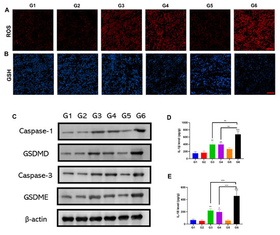Pyroptosis induced by RSL3/BP@PLEL. (A) ROS level (DHE dye, red fluorescence) and (B) GSH level (ThiolTracker dye, blue fluorescence) in mouse tumors resected from each treatment group, scale bar = 50 µm. (C) Expression of caspase-1, GSDMD, caspase-3, and GSDME in tumor tissues from each treatment group using western blotting analysis. Cytokine levels, including (D) IL-1β and (E) IL-18 levels, in tumor tissues from each treatment group. G1: Control group; G2: NIR + PLEL hydrogel group; G3: NIR + BP@PLEL hydrogel group; G4: NIR + RSL3/PLEL hydrogel group; G5: RSL3/BP@PLEL hydrogel group; G6: NIR + RSL3/BP@PLEL hydrogel group. All data are shown as mean ± SD (n = 3), * p < 0.05, ** p < 0.01, and *** p < 0.001 vs. NIR + RSL3/BP@PLEL group.