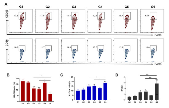 The collected tumors were cut into 1 mm3 pieces using a pair of scissors. The tumor pieces were then placed on a sterile steel mesh and washed with PBS to collect the cell suspension. Lymphocytes in the suspension were obtained by adding 35% Percoll, followed by centrifugation at 600× g for 15 min. Thereafter, the lymphocyte suspension was further centrifuged at 1400 rpm for 5 min to collect lymphocytes and washed with 4 °C PBS two times. The lymphocytes were then labelled with the corresponding antibodies (CD45-APCY-CY7, F4/80-APC, CD86-BV510, and CD206-PE-cy7) at a dilution of 1:200 for 20 min in a refrigerator. After incubation, the lymphocytes were rinsed with PBS, centrifuged, and resuspended for flow cytometry analysis. The distribution of TAMs was analyzed using FlowJo 10.8.1 software.