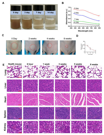 Biodegradability and biosafety of RSL3/BP@PLEL. (A) In vitro abiotic aging of RSL3/BP@PLEL across 14 days. (B) UV-Vis spectrum of RSL3/BP@PLEL after storage for 0, 3, 7, and 14 days. (C) In vivo biodegradability of RSL3/BP@PLEL in mice for 8 weeks. (D) A plot of hydrogel volume versus time after subcutaneous (s.c.) injection of RSL3/BP@PLEL in mice for 8 weeks. (E) H&E staining of the major organs of mice at 0, 6 h, 1, 3, 5, and 8 weeks post s.c. administration, scale bar = 50 µm. All data are shown as mean ± SD (n = 3).