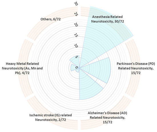 Out of 72 published literature studies analyzed, the study frequency score for anesthetic-related neurotoxicity was highest, i.e., 30/72, while for ischemic stroke (IS)-related neurotoxicity was lowest, i.e., 2/72. Furthermore, AD, PD, heavy metal-induced, and other forms of neurotoxicity frequency were found to be 15/72, 15/72, 4/72, and 6/72, respectively (Figure 1 and Figure 2). Neurotoxicity induced by anesthetics included sevoflurane-induced, bupivacaine-induced, ketamine-induced, propofol-induced, and isoflurane-induced neurotoxicity. The AD patients suffer from neurotoxicity due to amyloid-β peptide, and PD patients have 6-hydroxydopamine, 1-methyl-4-phenylpyridinium/MPP(+)-induced and atrazine-induced neurotoxicity. Heavy-metals-induced neurotoxicity is related to arsenic (As) and lead (Pb). Other neurotoxicants included glutamate-induced neurotoxicity, triazophos-induced toxicity, METH-mediated neurotoxicity, T helper cell 1 (Th1)-skewed neurotoxicity, lidocaine-induced neurotoxicity, and oxygen-glucose deprivation/reoxygenation (OGD/R)-induced neurotoxicity.