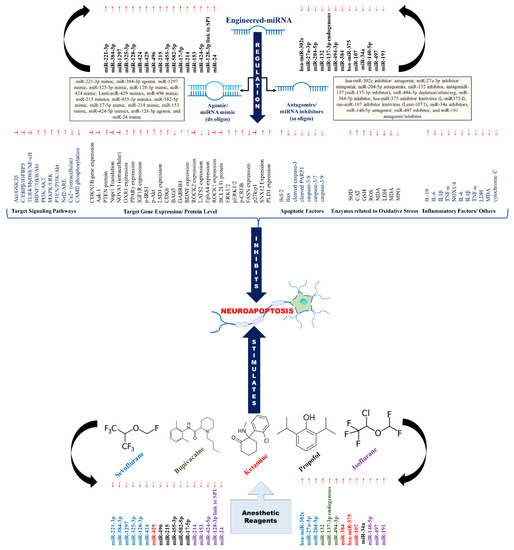 A schematic overview of attenuation mechanism against anesthesia-induced neurotoxicity via engineered miRNAs (agomir/antagomir) (↑ = upregulation/activation/stimulation; ↓ = downregulation; ┴ = inhibition/inactivation ■ = sevoflurane ■ = bupivacaine ■ = ketamine ■ = propofol ■ = isoflurane).