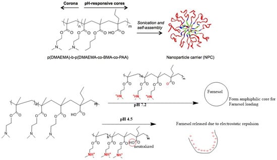 The loading of farnesol inside the micelles was achieved via sonication, with a loading ratio up to 22 wt% and a loading efficiency of 100%. Farnesol is a hydrophobic antibacterial agent, but has limited antibiofilm effects after topical applications. The pH-responsive delivery vehicle was therefore used to enhance drug efficacy through high affinity binding and pH-responsive drug release. The farnesol release half-life was 7 h and 15 h at pH 4.5 and pH 7.2, respectively, indicating pH-responsive release behaviour. Moreover, nearly all farnesol (75%) was released within 12 h at pH 4.5, in contrast to the 30 h required for complete release at pH 7.2. At physiological pH (pH 7.2), DMAEMA was protonated and PAA was deprotonated, creating an amphiphilic core for farnesol, while at an acidic pH (pH 4.5) DMAEMA was completely protonated and PAA was neutralized. Electrostatic repulsion occurs due to protonation between the micelle corona and the core, leading to the disruption of micelle structures and drug release (see Figure 3). Significant antibiofilm activity of farnesol-loaded nanoparticles was observed, with an 80% decrease in the S. mutans biofilms’ viability compared to a modest 20% reduction in the free farnesol treated group. In addition, nanocarriers by themselves did not show any antibacterial/antibiofilm activity. The enhanced antibiofilm effect was likely due to the greater binding between the positively charged nanoparticles at acidic conditions and the negatively charged microbial surfaces, as well as the pH-triggered drug release, which prolonged the farnesol retention and increased drug bioavailability at the pellicle–biofilm interface as well as inside the biofilm [30,31].