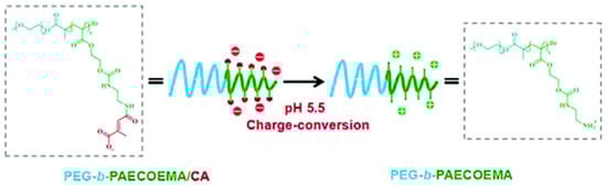 Schematic illustration of the chemical structure of PEG-b-PAECOEMA copolymers and the mechanism of the pH-responsive drug release. PEG-b-PAECOEMA block is negatively charged in neutral conditions. As citraconic amide of PEG-b-PAECOEMA/CA micelles degrades in acidic environments, the primary amine at the end of PEG-b-PAECOEMA becomes protonated and is positively charged [42].